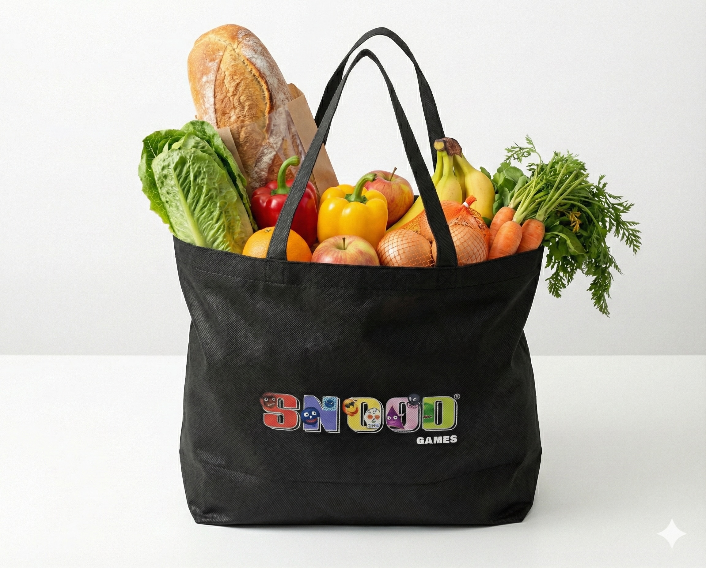 Show off all your Snood favorites with this vibrant black tote bag. With every character, a roomy main compartment, sturdy non-woven fabric, and comfortable 20-inch handles, it’s both fun and practical. Ships free in the USA!